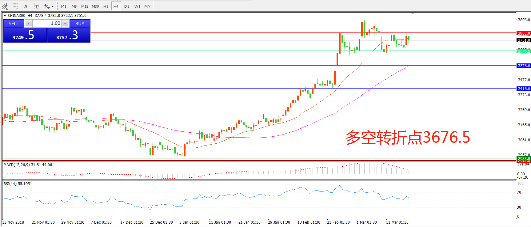 4小时图看,CHINA300中华指数近期呈现高位整理形态,但整体走势依然偏多,均线系统呈多头排列, MACD红柱缩减,日内延续震荡概率较大。