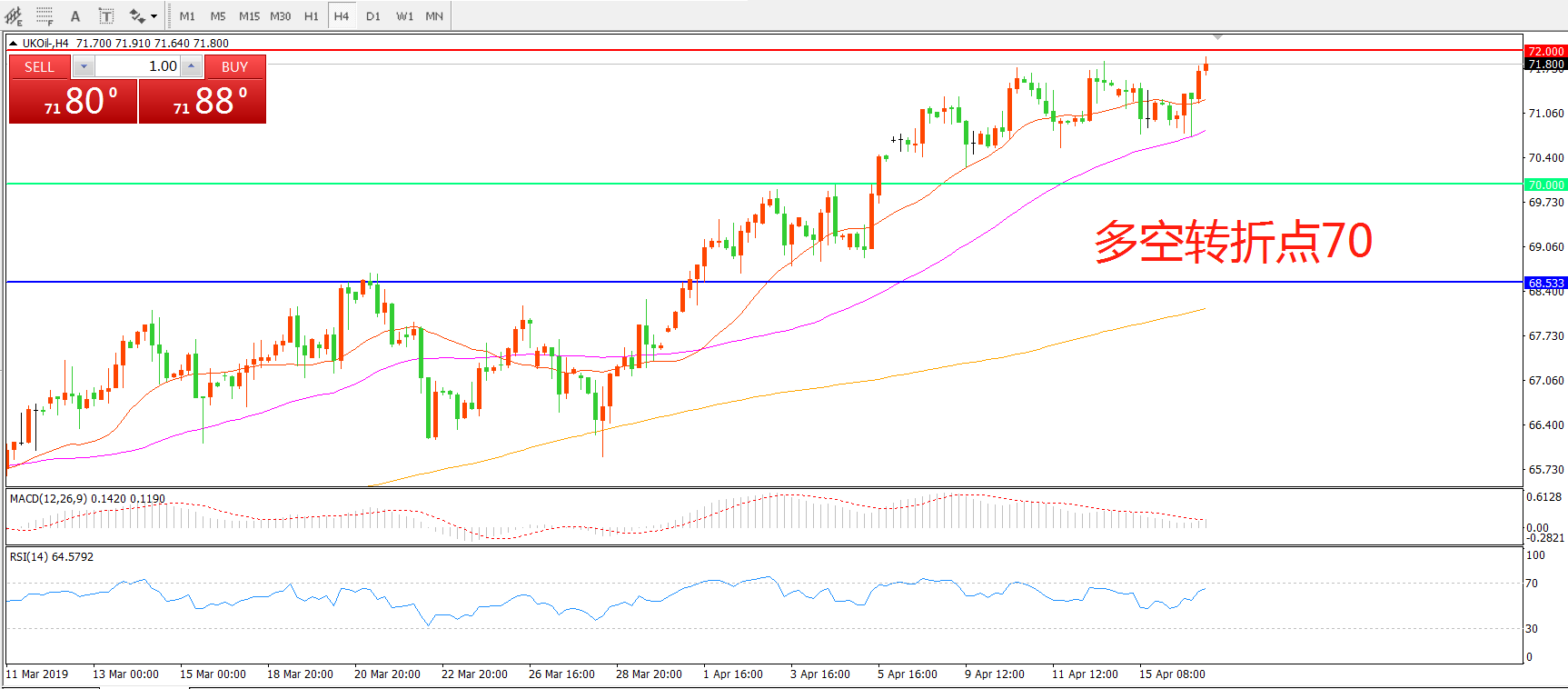 4小时图看,油价触碰55均线后出现反弹,阳线连续拉升,短线走势偏强,MACD红柱减少,RSI指标向上,重点关注上方72一线阻力,突破后或将开启新一波拉升。