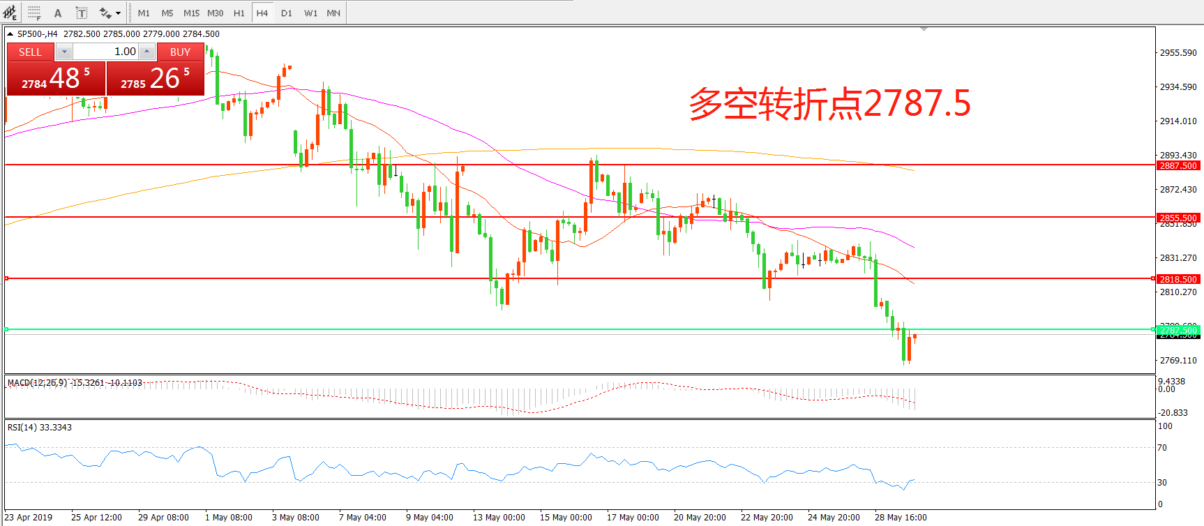 4小时图看,标普500冲高回落,长阴连续破位,短期走势偏空,均线系统逐渐呈空头排列,MACD绿柱增加,日内可能有小幅反弹,但整体走势偏空。