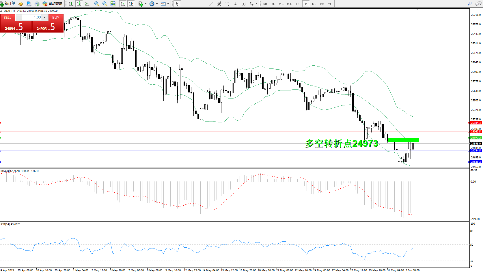 道琼斯指数收涨4.70点,涨幅0.02%,报24819.78点。多家投行下调美国经济预期。投资者正在权衡美联储降息的可能性,圣路易斯联储主席称美联储可能很快就要被迫降息。资者担心中美之间的贸易紧张关系,以及美国威胁对墨西哥征收关税,将损害全球经济。上月亚洲和欧洲制造业活动都出现萎缩,因担心全球经济衰退,这加重投资者的担忧。