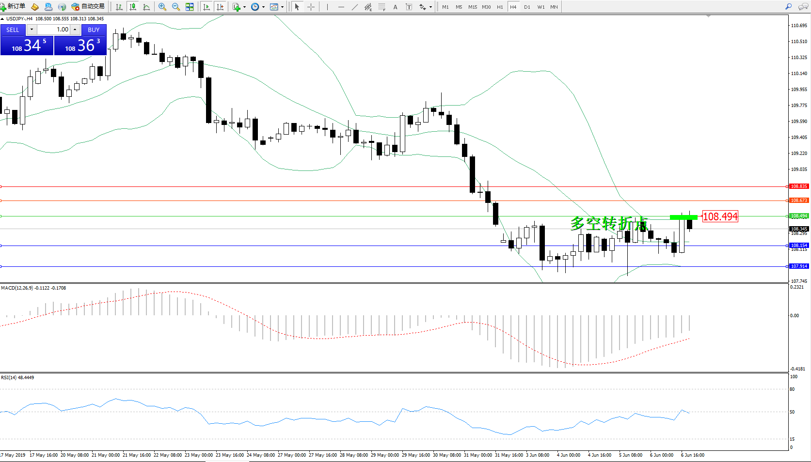 交易策略:108.494下方看跌,目标108.154107.914