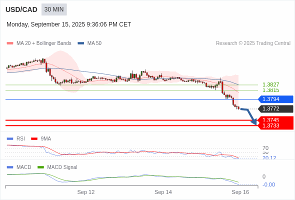 技术点评: RSI技术指标小于30。在这种情况下,说明有很强的下跌趋势,或者意味着处在超卖的状态下,可能会有向上的反弹。我们将观察RSI技术指标是否出现背离现象。 MACD技术指标处在其信号线之下看空。 配置为负。 此外,价位低于其20天及50天移动平均线 ( 分别位于1.3810 和1.3828 )。