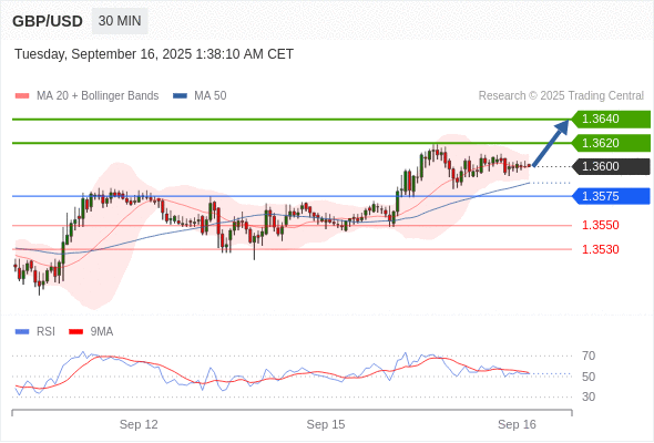 在 1.3575 之上,看涨,目标价位为 1.3620 ,然后为 1.3640 。