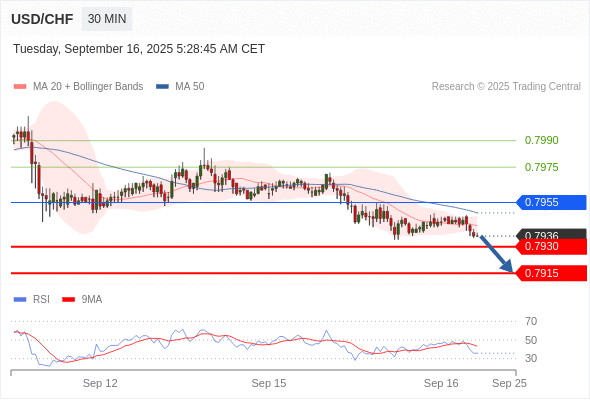 在 0.7955 之下,看跌,目标价位为 0.7930 ,然后为 0.7915 。