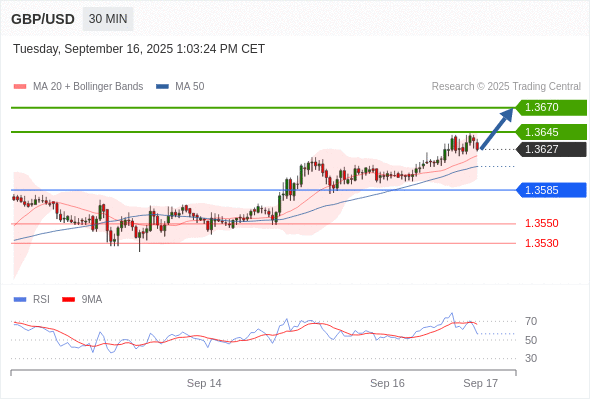 在 1.3585 之上,看涨,目标价位为 1.3645 ,然后为 1.3670 。