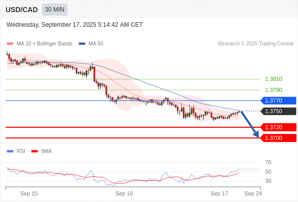 在 1.3770 之下,看跌,目标价位为 1.3720 ,然后为 1.3700 。