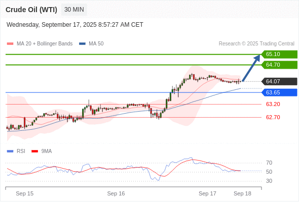 美国原油 (WTI) 期货 (X5) 当日内: 在63.65之上,看涨。