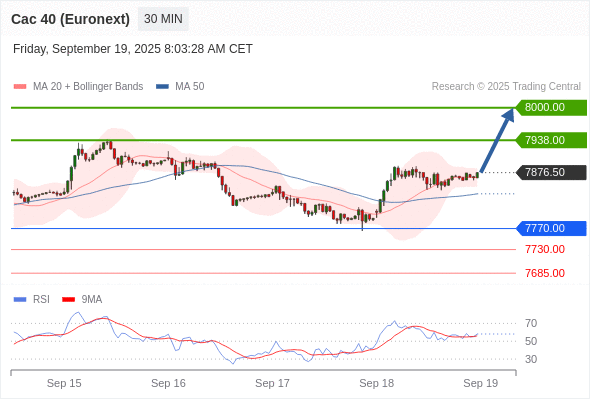 法国CAC指数期货 (Euronext) (U5) 当日内: 在7770.00之上,看涨。
