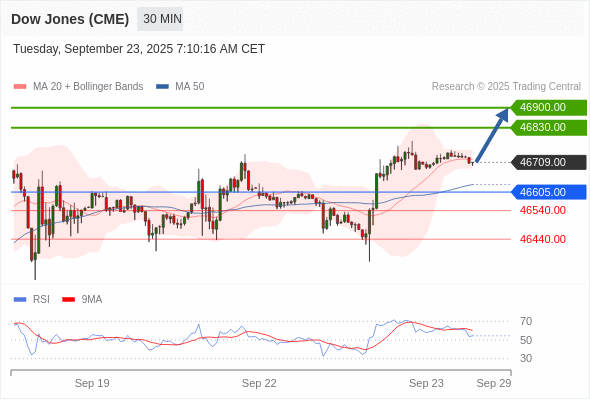 美国道琼斯指数期货 (Z5) 当日内: 在46605.00之上,看涨。