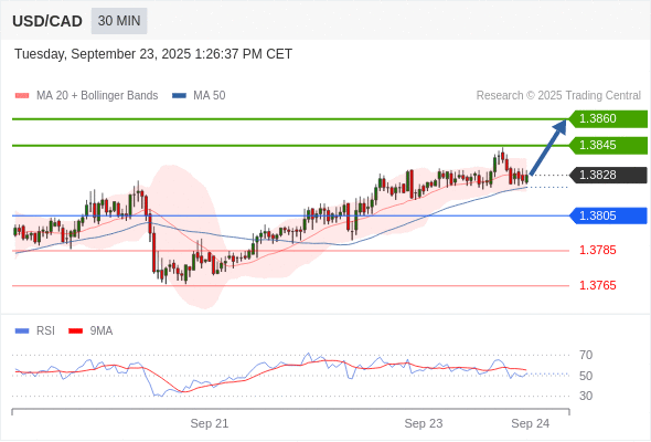 在 1.3805 之上,看涨,目标价位为 1.3845 ,然后为 1.3860 。
