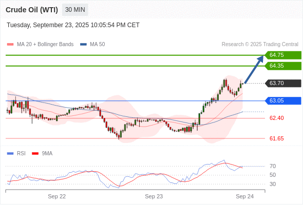 在 63.05 之上,看涨,目标价位为 64.35 ,然后为 64.75 。