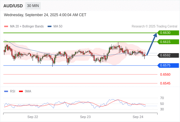 在 0.6575 之上,看涨,目标价位为 0.6615 ,然后为 0.6630 。