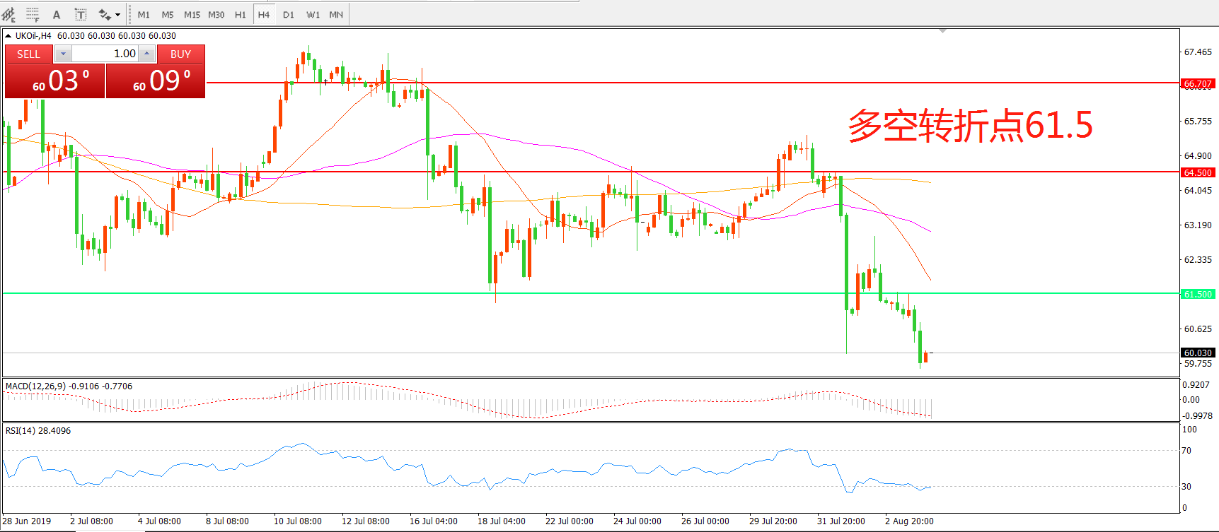 受中美贸易摩擦升级的影响,大宗商品市场周一继续下跌,布伦特原油周一(8月5日)延续弱势下行,最终收报60.03美元/桶。中美贸易摩擦可能会抑制两个全球最大经济体对燃料的需求,同时中美贸易问题和人民币贬值引爆了市场的恐慌情绪,风险资产大幅下跌,美国三大股指惨遭“血洗”,经济放缓阴云再次笼罩全球。