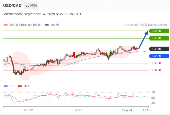 在 1.3820 之上,看涨,目标价位为 1.3870 ,然后为 1.3890 。