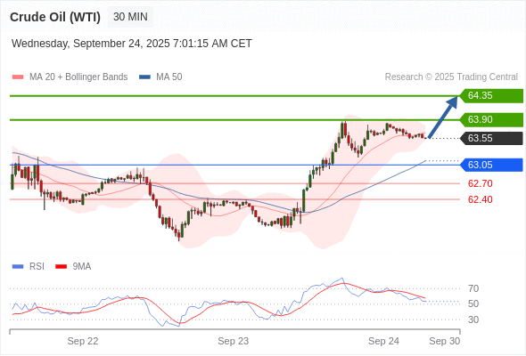 在 63.05 之上,看涨,目标价位为 63.90 ,然后为 64.35 。