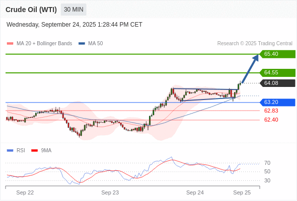 在 63.20 之上,看涨,目标价位为 64.55 ,然后为 65.40 。