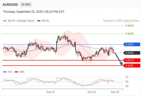 在 0.6605 之下,看跌,目标价位为 0.6575 ,然后为 0.6565 。