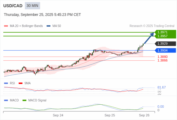 美元/加元 当日内 : RSI是超买的