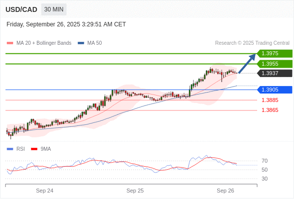 在 1.3905 之上,看涨,目标价位为 1.3955 ,然后为 1.3975 。