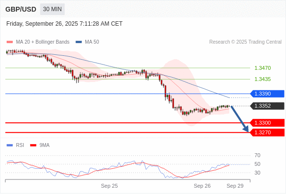 交易策略: 在 1.3390 之下,看跌,目标价位为 1.3300 ,然后为 1.3270 。