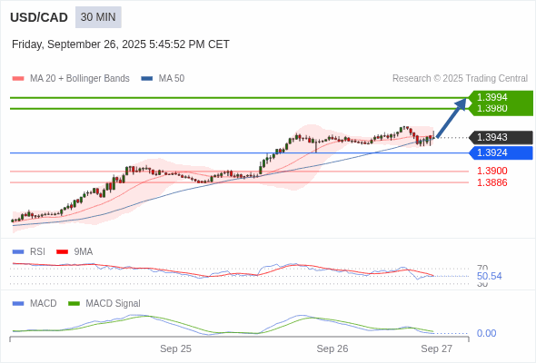 美元/加元 当日内 : 看涨,当 1.3924 为支撑位,目标定在1.3994。