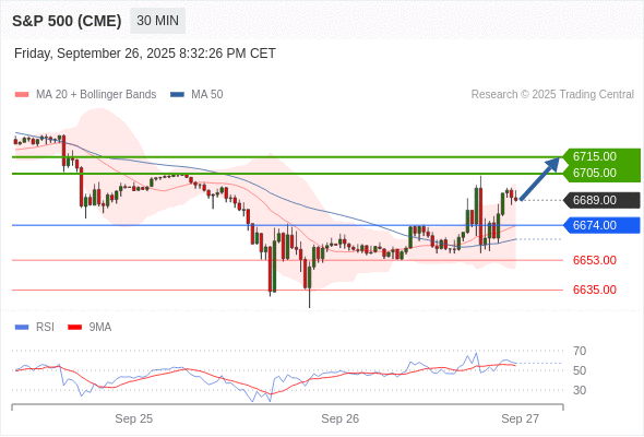在 6674.00 之上,看涨,目标价位为 6705.00 ,然后为 6715.00 。