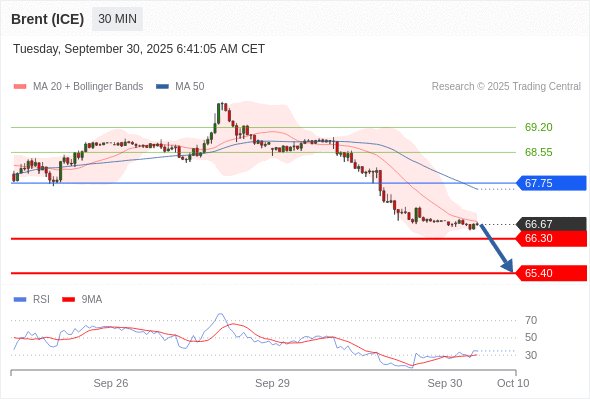 在 67.75 之下,看跌,目标价位为 66.30 ,然后为 65.40 。
