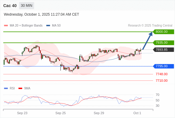 Cac 40 当日内: 在7795.00之上,看涨。