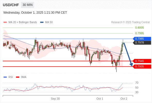 在 0.7985 之下,看跌,目标价位为 0.7945 ,然后为 0.7935 。