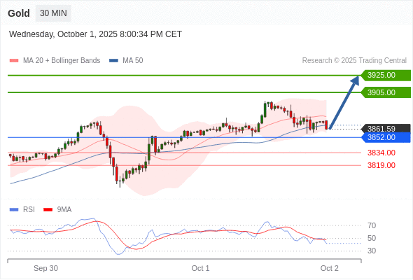 交易策略: 在 3852.00 之上,看涨,目标价位为 3905.00 ,然后为 3925.00 。