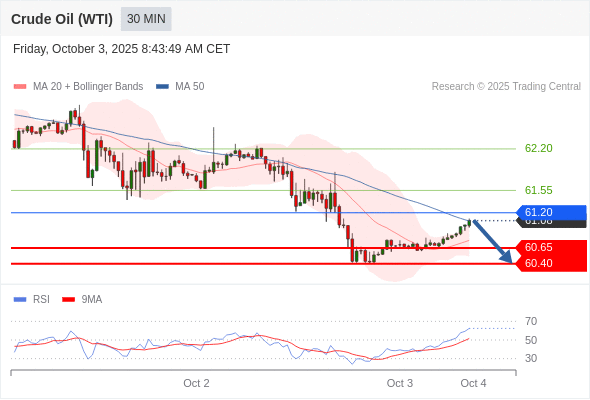 在 61.20 之下,看跌,目标价位为 60.65 ,然后为 60.40 。