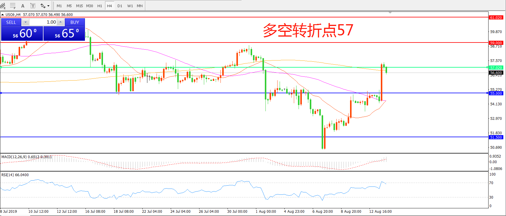 周二(8月13日),美国宣布将推迟对部分中国产品征收关税,并宣布双方同意继续进行贸易谈判,双方约定在未来两周内再次通话,金融市场瞬间掀起惊涛骇浪,美油布油双双大幅上涨,随后小幅回落,美国WTI原油最终收报56.61美元/桶。