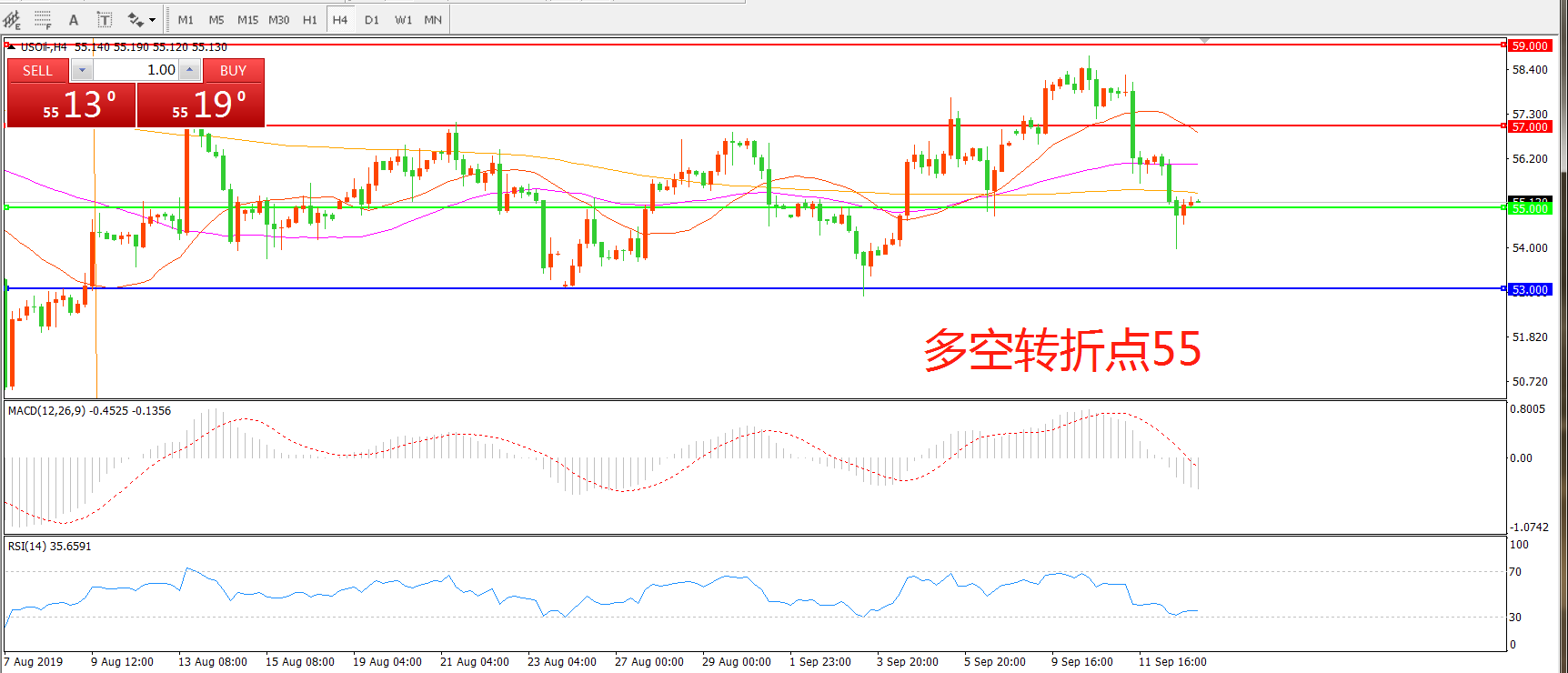 受到欧洲央行宽松举措以及中美贸易方面的消息的影响,金融市场短线剧烈波动, OPEC周四(9月12日)宣布同意要求伊拉克和尼日利亚达成减产来抑制原油供应,任何关于深度减产的正式决定都只能在12月的OPEC政策会议上做出,这令原油多头士气遭受抑制,美油震荡下行,最终收报55.14美元/桶。