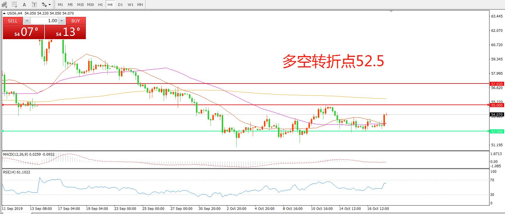 4小时图看,油价长阳反弹,突破短期整理区间,短期有可能上行测试上方55美元一线阻力,整体走势有所回暖,21周期均线与55周期均线粘合,RSI指标走平,日内延续震荡概率较大。