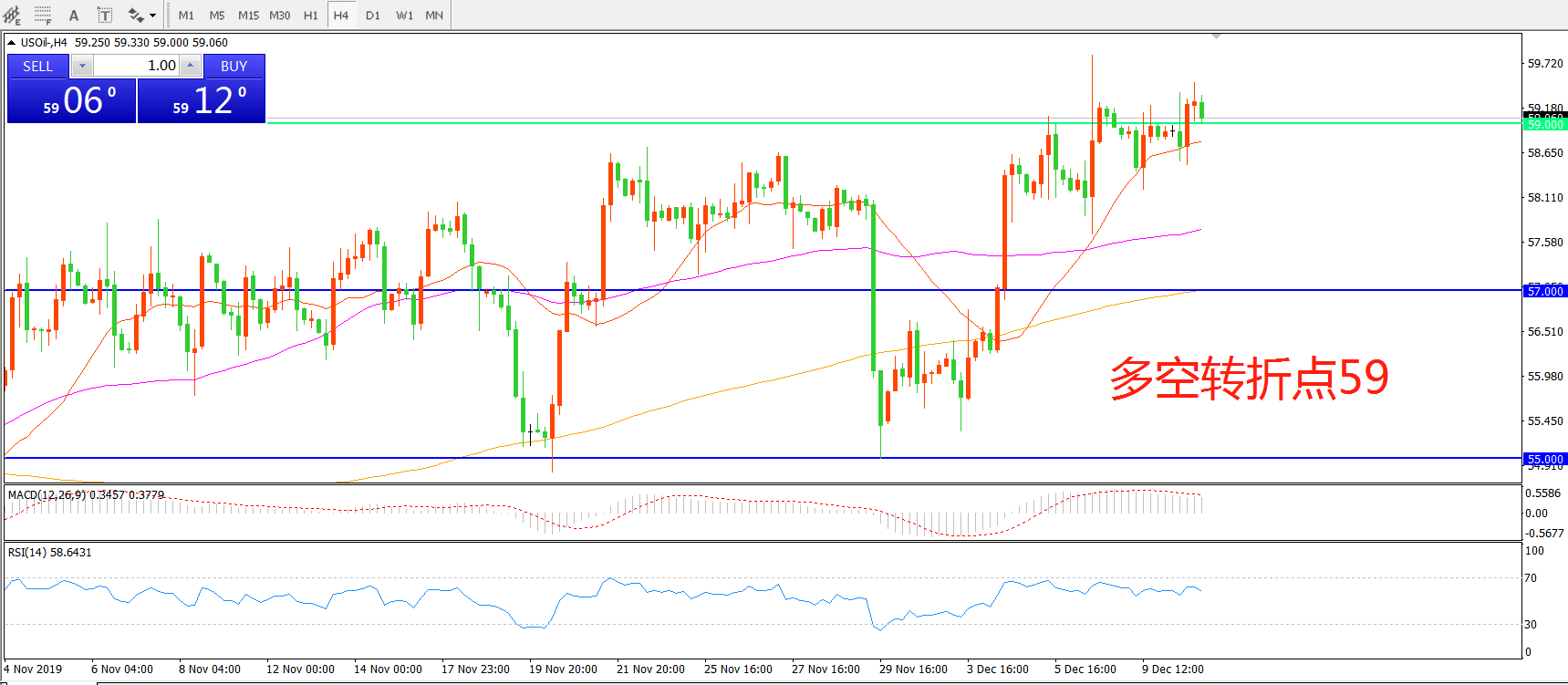 4小时图看,油价延续震荡上行,突破并站稳59一线,短期走势偏强,均线系统呈多头排列,MACD红柱减少,RSI指标走平,日内延续上行概率较大。