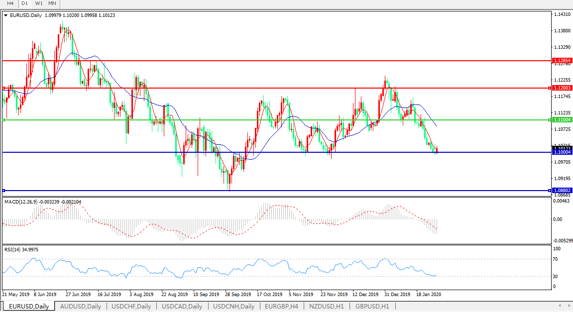 技术面简析:日图均线呈有序空头排列,汇价弱势下行试探1.10关口,MACD下穿0轴且量能0轴下方继续放量 ,RSI逼近超卖区域后小幅走高,预计短期汇价大概率将进一步走低。