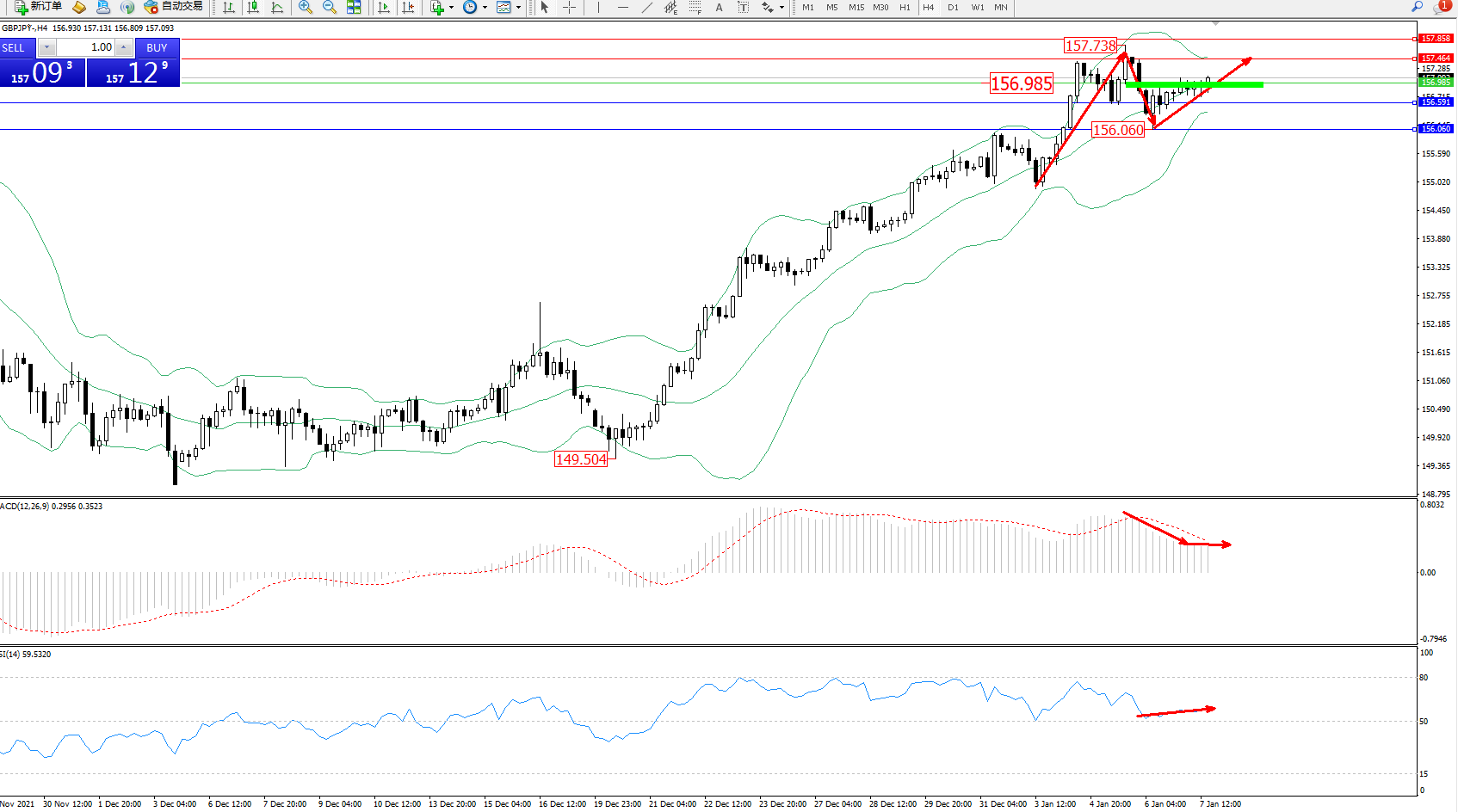 交易策略:156.985下方看跌,目标157.464、157.858