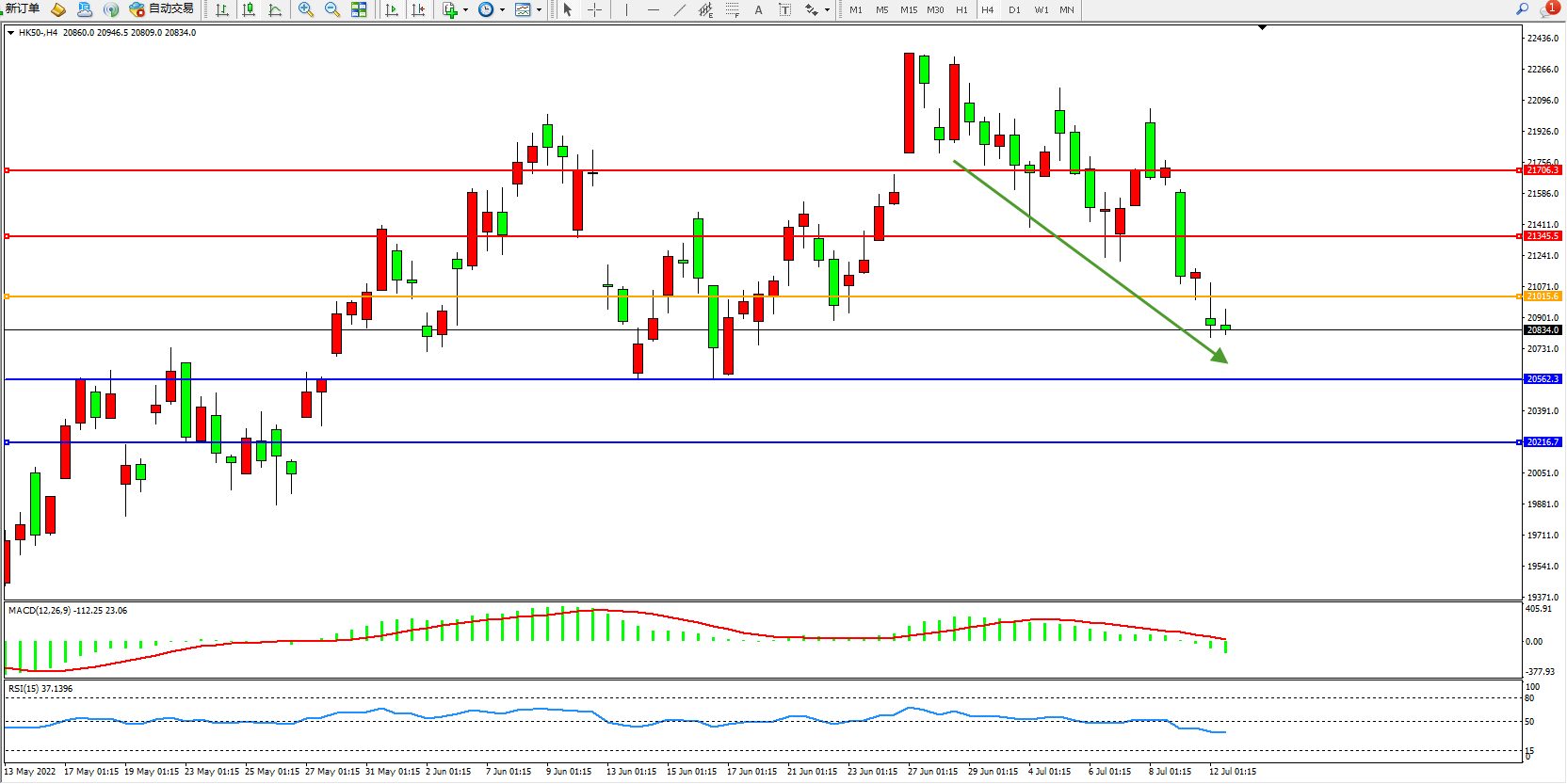 香港恒生指数7月12日(周二)收盘下跌279.46点,跌幅1.32%,报20844.74点;投资者主要忧虑疫情形势、通胀及美联储政策、经济衰退风险等因素。港股再度收跌,市场情绪低迷。恒生科技指数跌2.14%,恒指、恒科指均跌破21000点及4600点关键点位,并且录得2连跌。大型科技股全天表现弱势,专家预计三季度基建投资增速将呈现高增长,重型基建股走强明显,机构指煤炭维持高景气,煤炭股表现活跃,餐饮股午后拉升崛起。