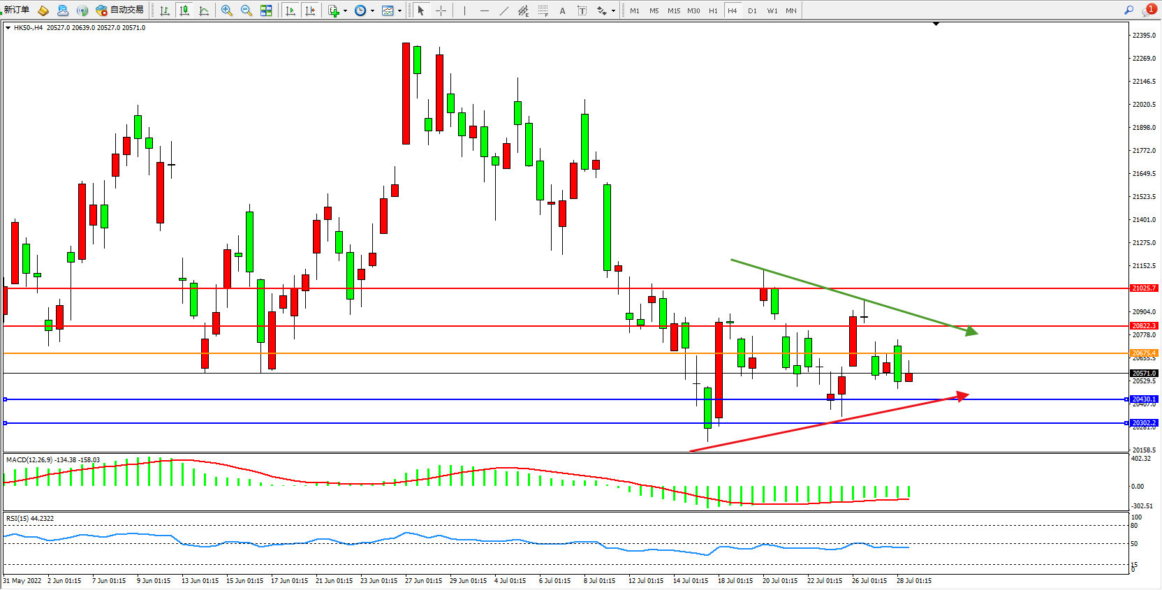 香港恒生指数7月28日(周四)收盘下跌47.36点,跌幅0.23%,报20622.68点;恒生科技指数相对较强,全天保持上涨行情,小幅收涨0.35%。型科技股涨跌不一,小米涨2.36%,百度涨1.69%,京东、阿里巴巴、美团跌超1%;机构料澳门最快11月下旬公布新赌牌结果,濠赌股表现活跃。