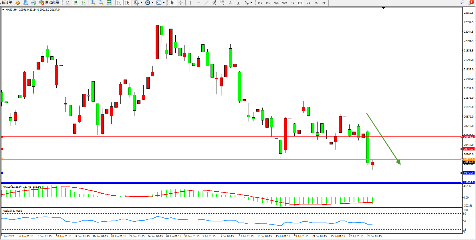 香港恒生指数7月29日(周五)收盘下跌466.17点,跌幅2.26%,报20156.51点;恒生指数收盘跌2.26%,7月累跌近8%;恒生科技指数跌4.86%,7月累跌超11%。港股三大指数全天呈单边下跌行情,且午后跌幅进一步扩大,恒生科技指数盘中一度跌5.6%,收跌4.86%,连续失守2道整数关口,恒指跌2.26%下挫近466点,二者均创下阶段新低。大型科技股领衔大市下跌,阿里巴巴、美团跌超6%,京东、百度、网易、腾讯均跌超4%。