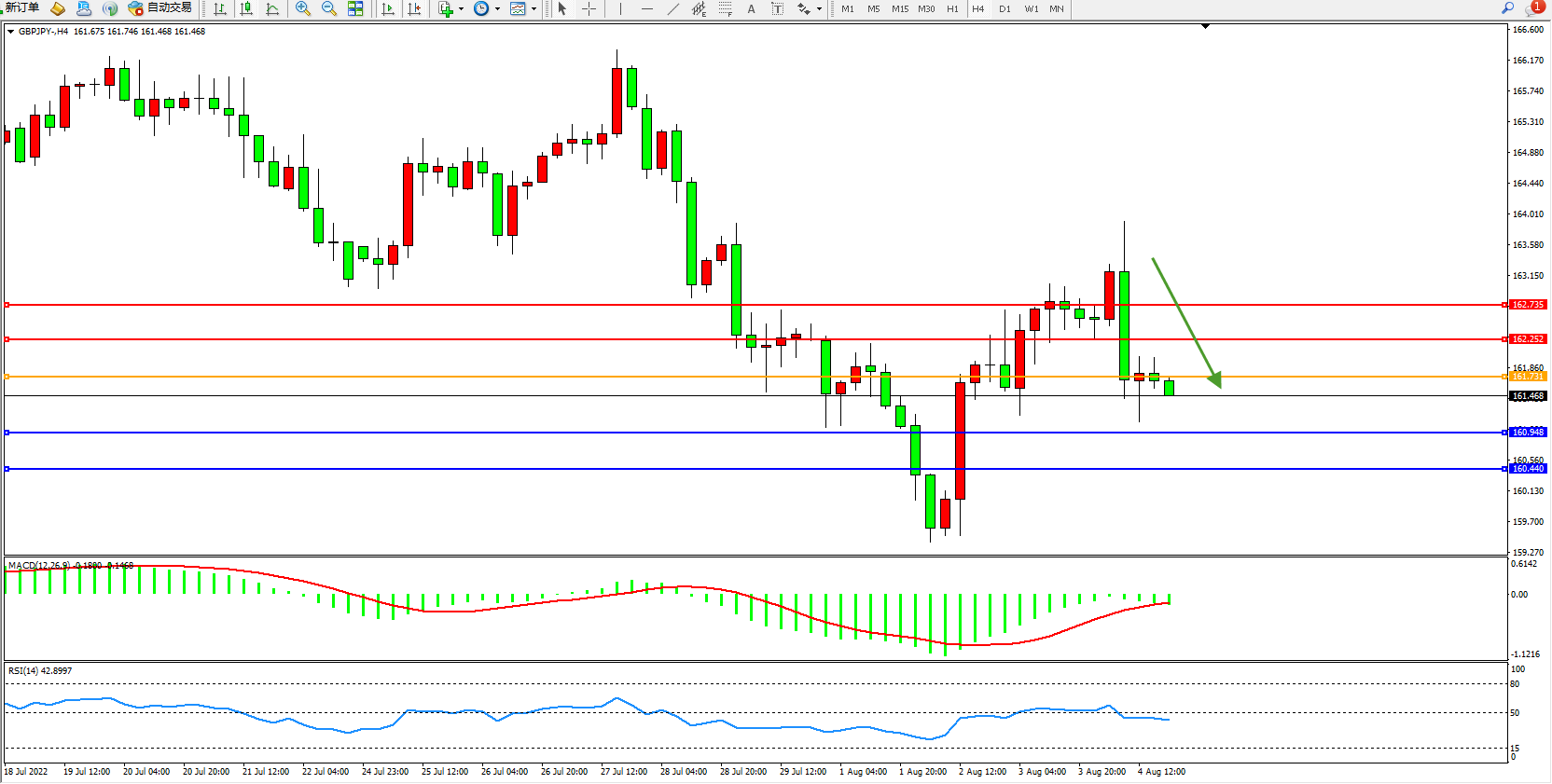 4小时图看:低位多头动力短期震荡拉升,遇阻后急速下挫,市场整体空头态势强劲,MACD指标处于0轴线下侧弱势徘徊,RSI指标处于50均衡线下侧窄幅整理;
