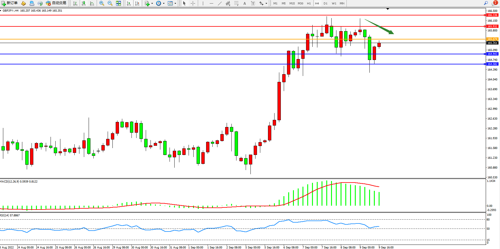 备选策略:165.474上方看涨,目标165.932、166.336