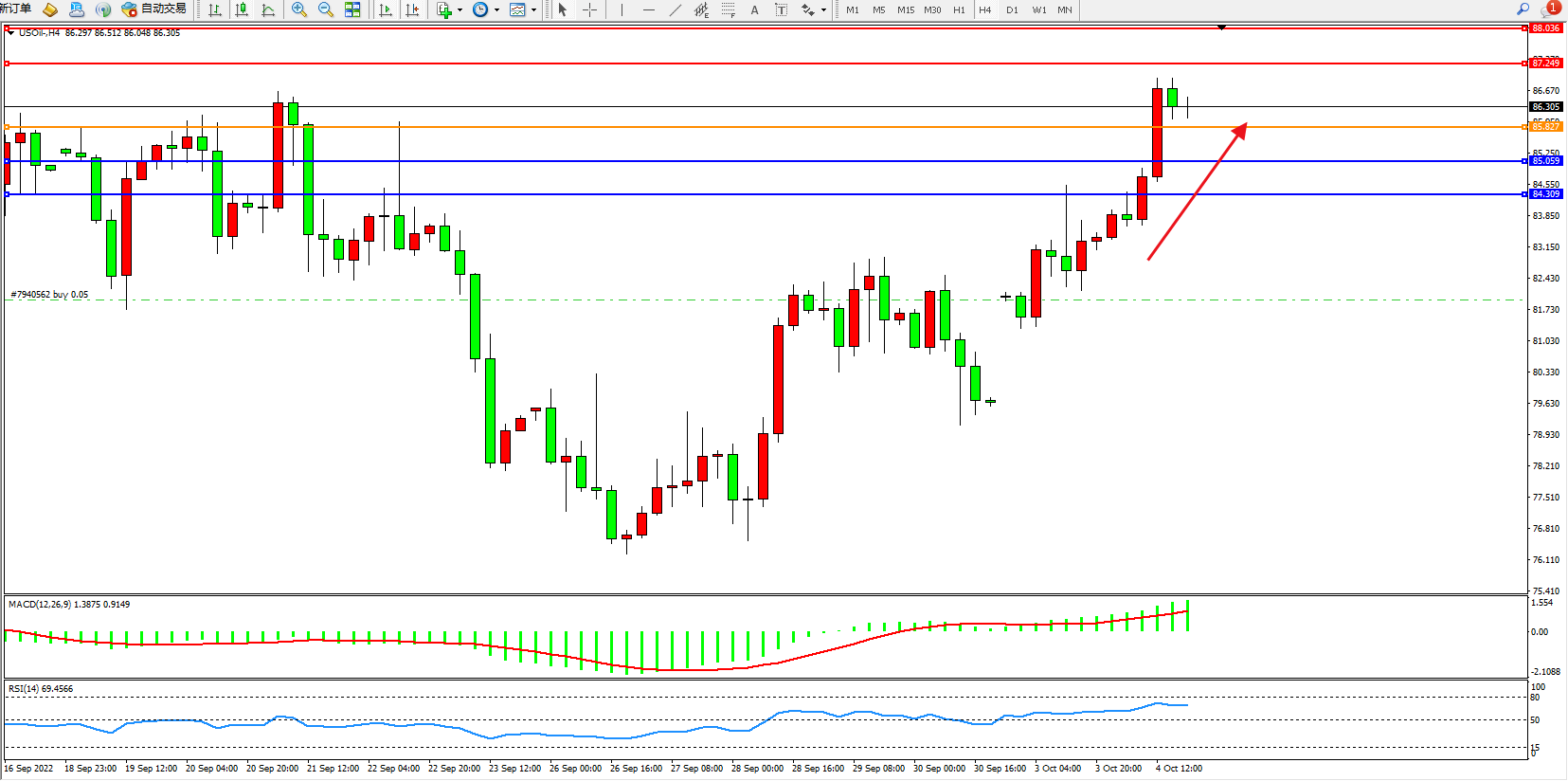 4小时图看:多头动力维持震荡拉升走势持续上扬,短期看涨情绪开始不断涌入,MACD指标处于多头区域维持缓慢上移,RSI指标处于多头区域维持高位徘徊;