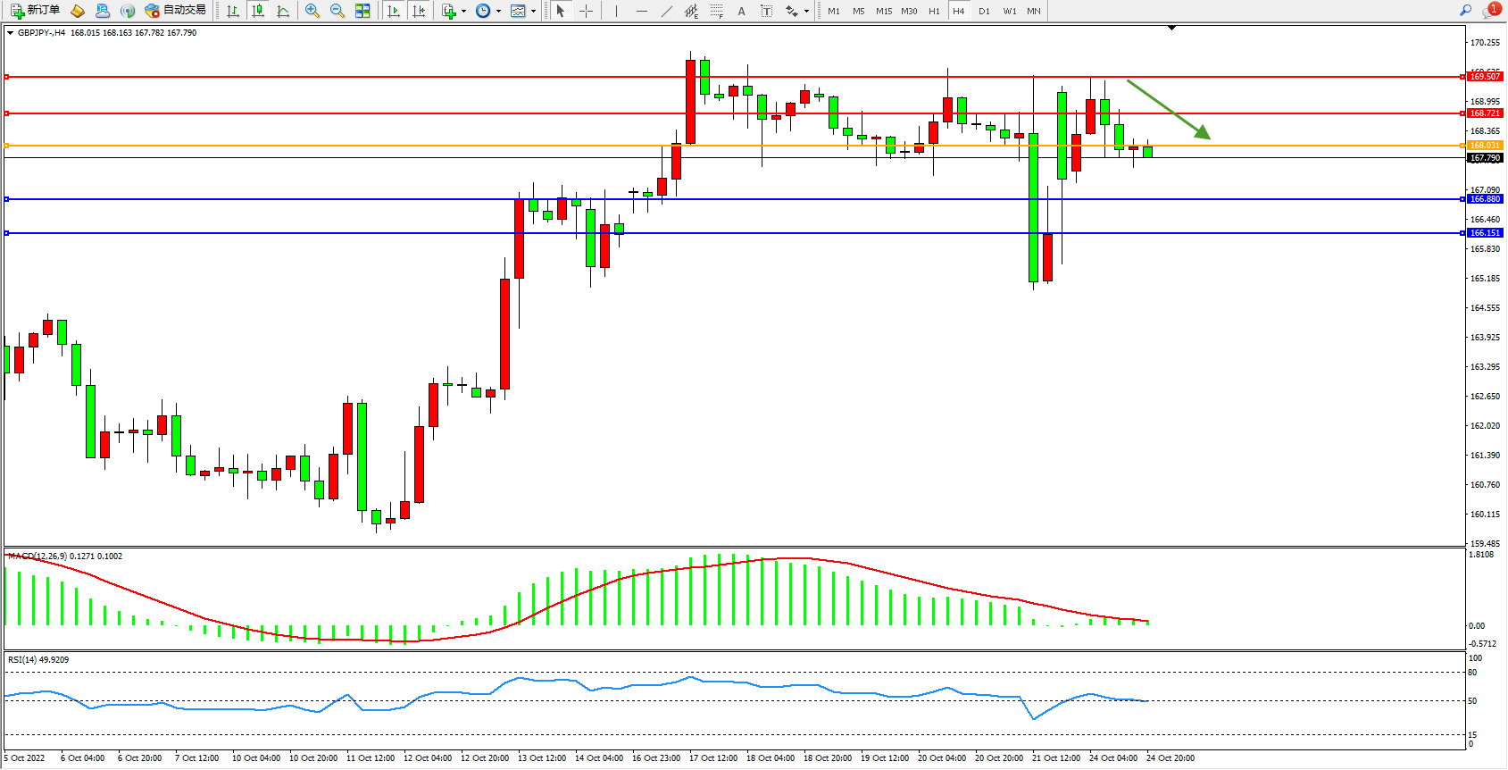 交易策略:168.031下方看跌,目标 166.880、166.151
