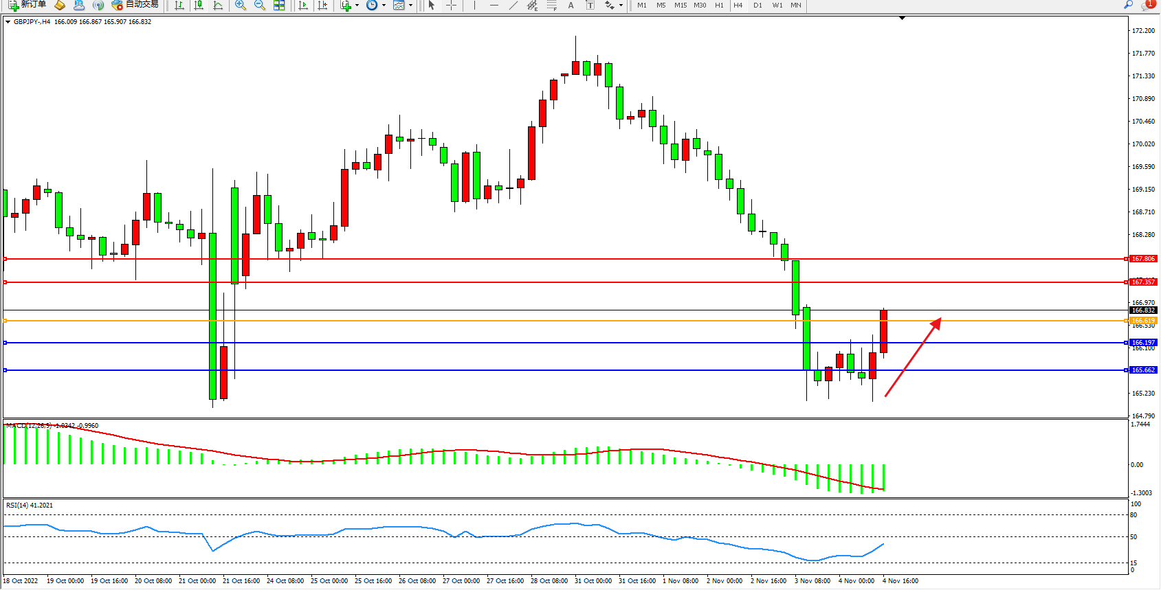 4小时图看:低位短期震荡整理后,多头动力急速拉升,市场多头情绪开始涌现,短期有继续向上移动态势,MACD指标处于空头区域整理,RSI指标处于空头区域震荡上移;