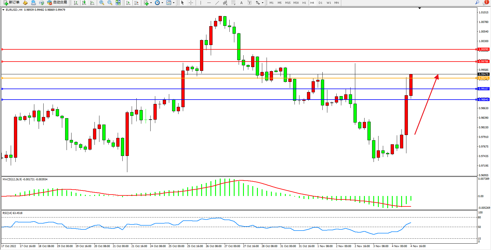 4小时图看:多头动力急速拉升,短期看涨情绪涌入,市场多头不断上扬,MACD指标处于空头区域低位震荡上移,RSI指标处于50均衡线上側上扬;