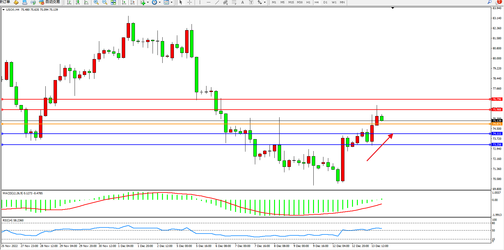 交易策略:74.871上方看涨,目标75.988、76.796