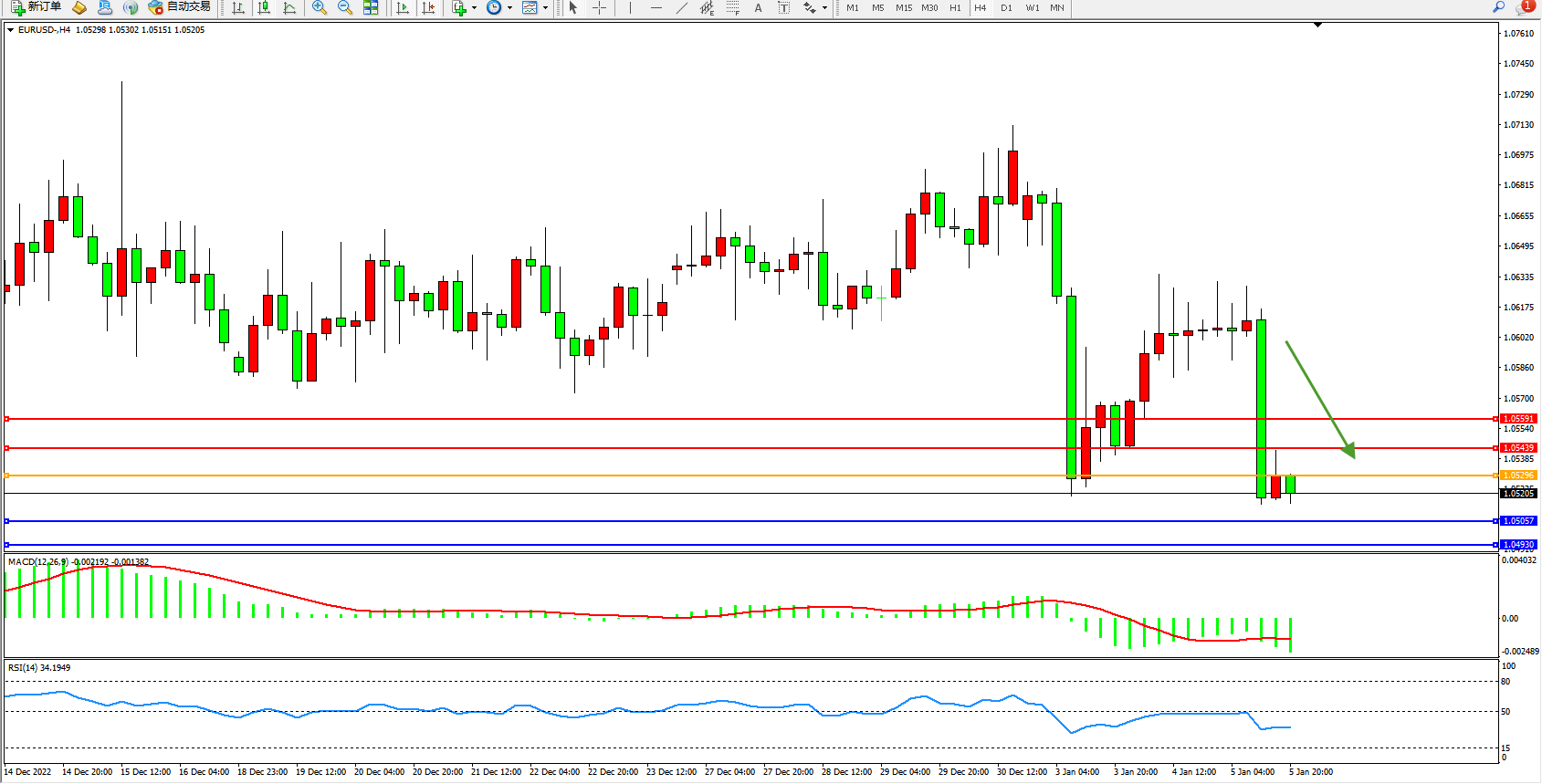 交易策略:1.05296下方看跌,目标1.05057、1.04930