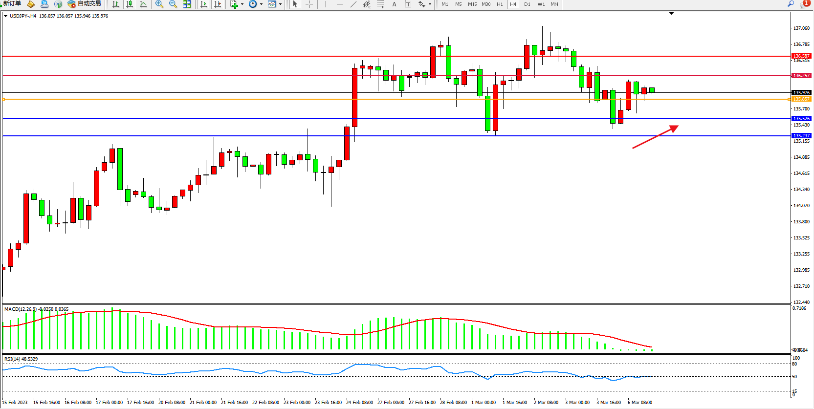 美元兑日圆维持135.976附近震荡,东京2月通胀数据连续第九个月超过日本央行的目标。若新任总裁植田和男上任后,在货币政策上有收紧的动作,或可刺激日元价值回归投机交易的重新抬头。