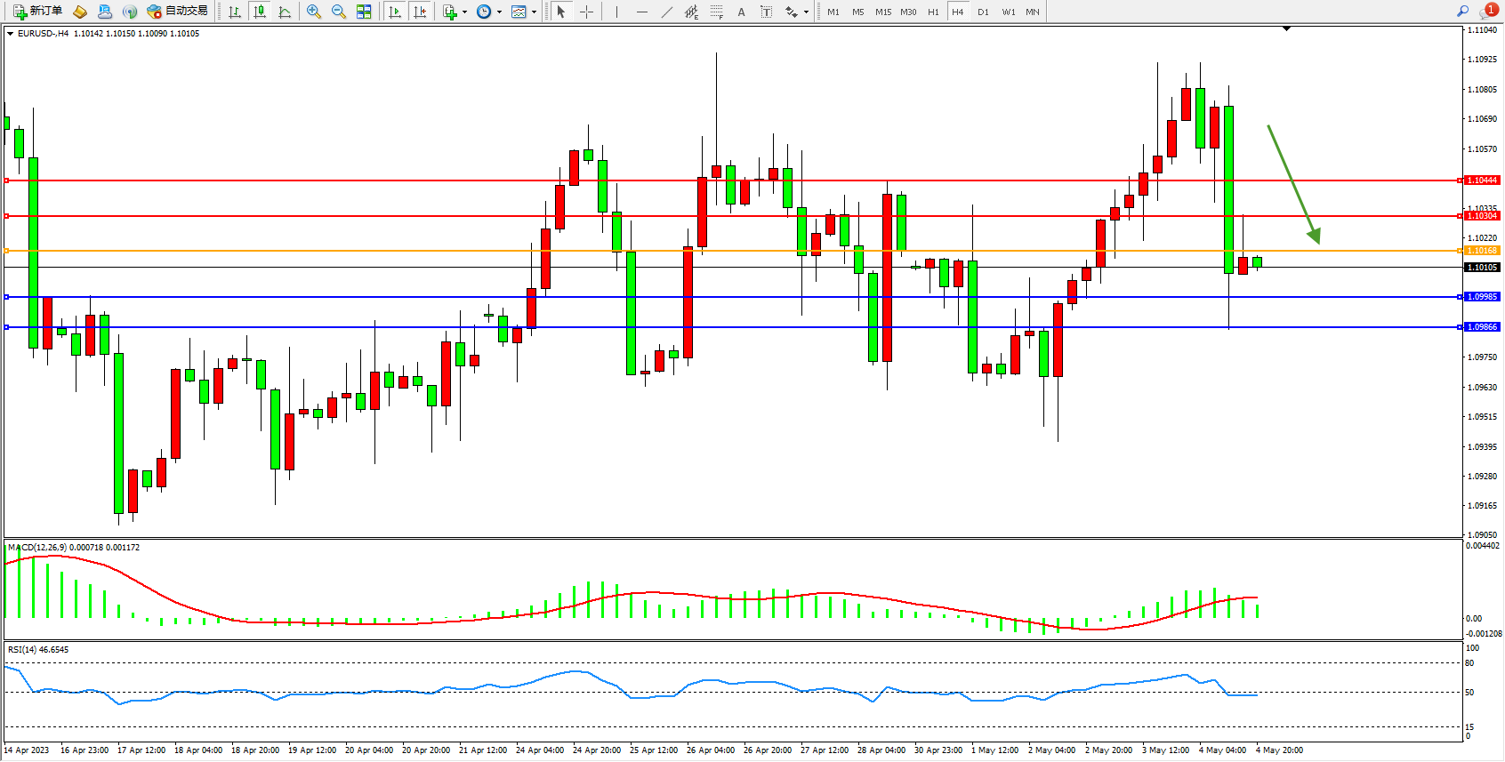 欧元兑美元维持1.10105附近震荡,欧元区至5月4日欧洲央行边际贷款利率 4%,预期4.00%,前值3.75%。欧洲央行将三大主要利率均上调25个基点至3.75%,符合市场预期,利率达2008年10月以来最高水平。